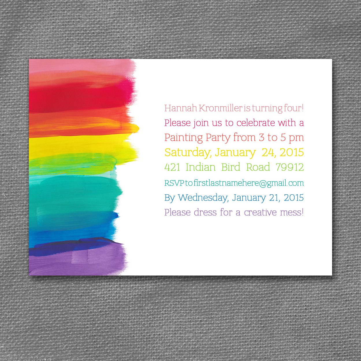 Rainbow paint 7 x 5 inch birthday invitation. All words will be changed to suit your needs. Colors cannot be adjusted on this invitation. Print where you would like.