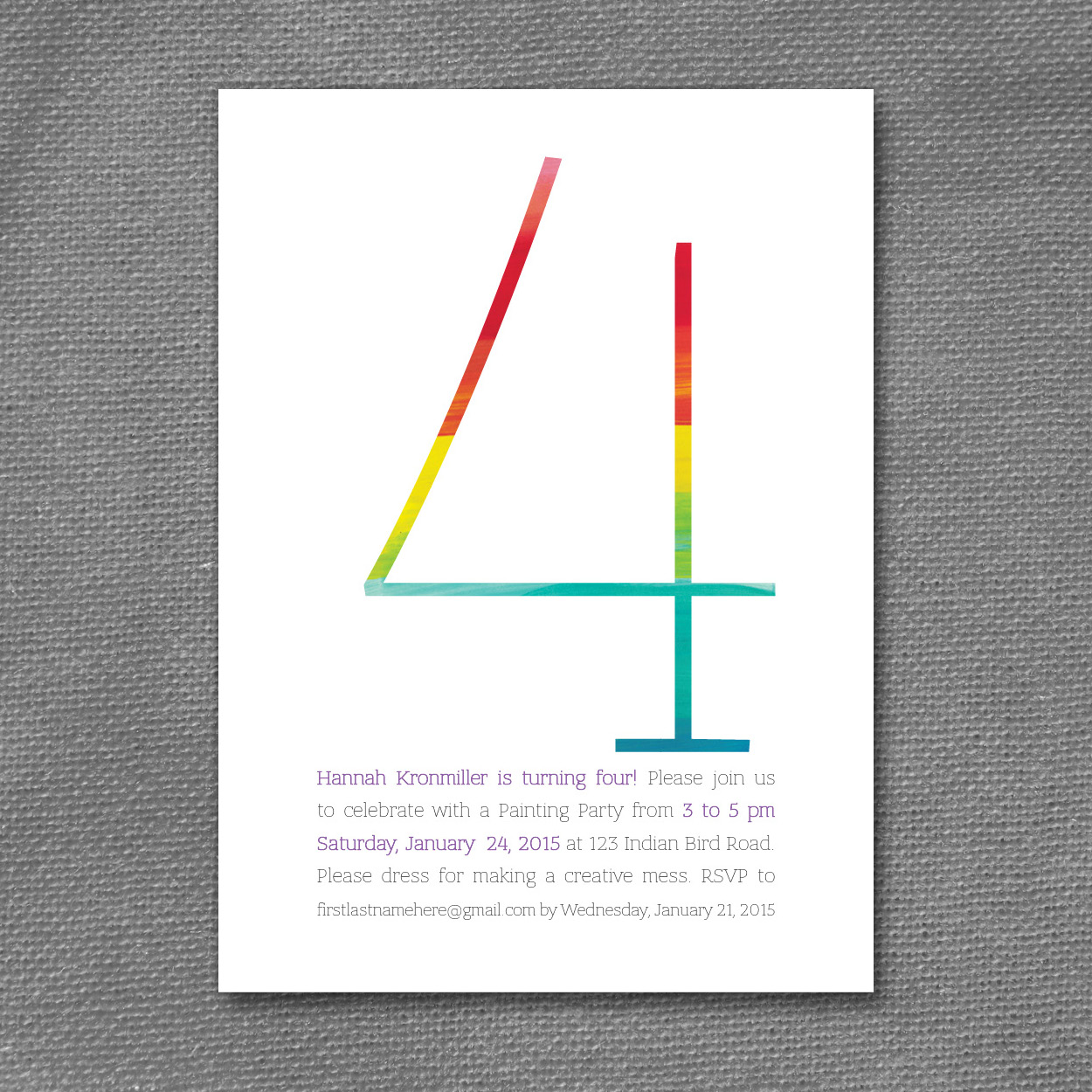 Large number rainbow 5 x 7 inch birthday invitation. All words will be changed to suit your needs. Colors CAN be adjusted on this invitation. Print where you would like.